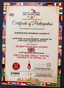 অক্সফোর্ডে আন্তর্জাতিক সম্মেলনে লাইফটাইম অ্যাচিভমেন্ট সম্মাননা পেলেন বাংলাদেশের সন্তান ব্যারিস্টার মনোয়ার হোসেন