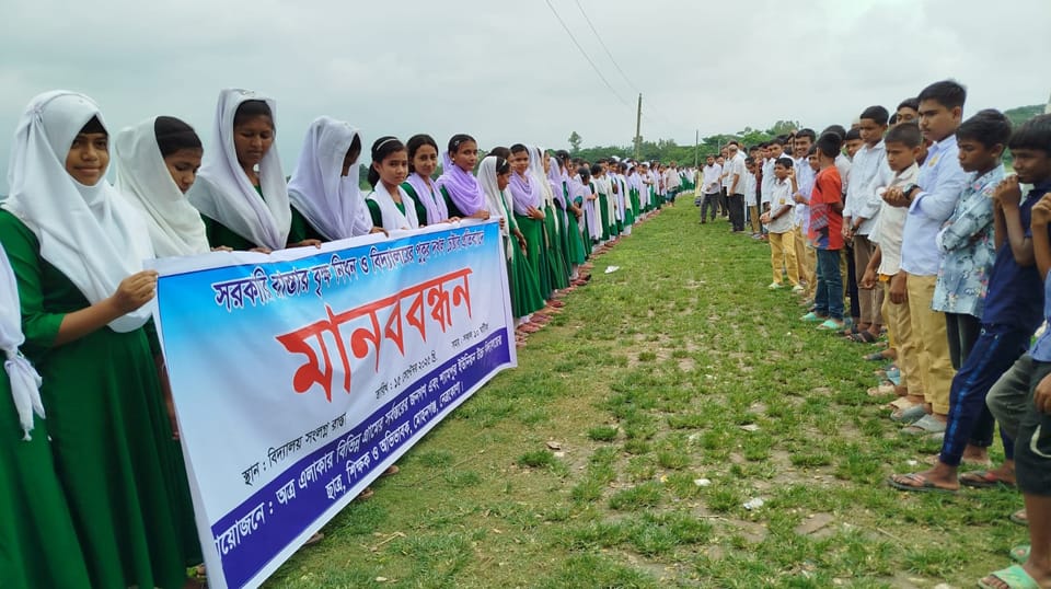 মোহনগঞ্জে বিদ্যালয়ের জায়গা দখল ও সড়কের গাছ কাটার প্রতিবাদে মানববন্ধন